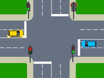 Both cars are facing green lights. As Car A is indicating to turn right it must give way to all vehicles approaching from the opposite direction before turning.