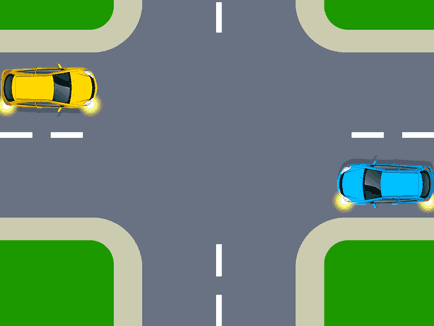 In this T-intersection, Car A is on the terminating road and so must give way to all vehicles approaching from either direction on the continuing road.
