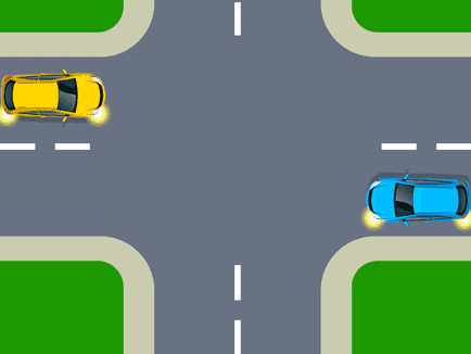 In this T-intersection, Car A is on the terminating road and so must give way to all vehicles approaching from either direction on the continuing road.